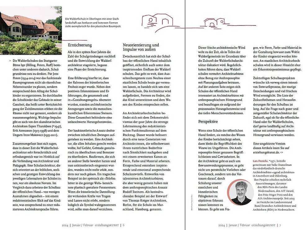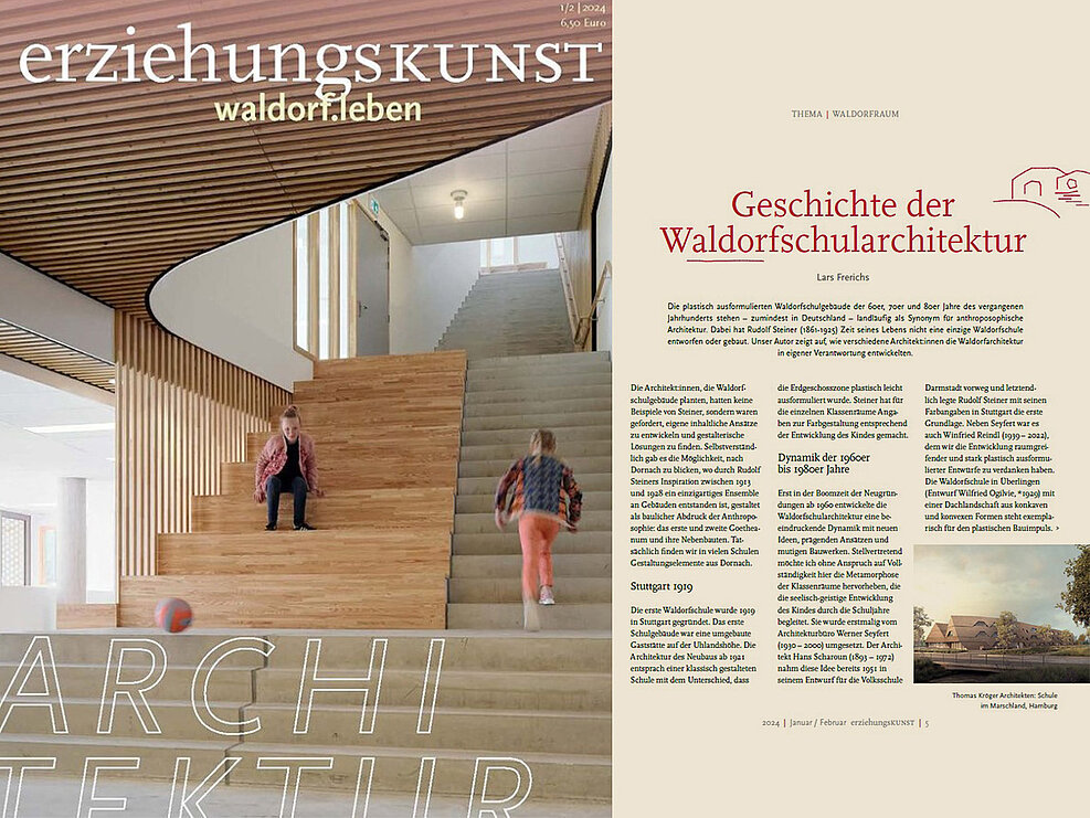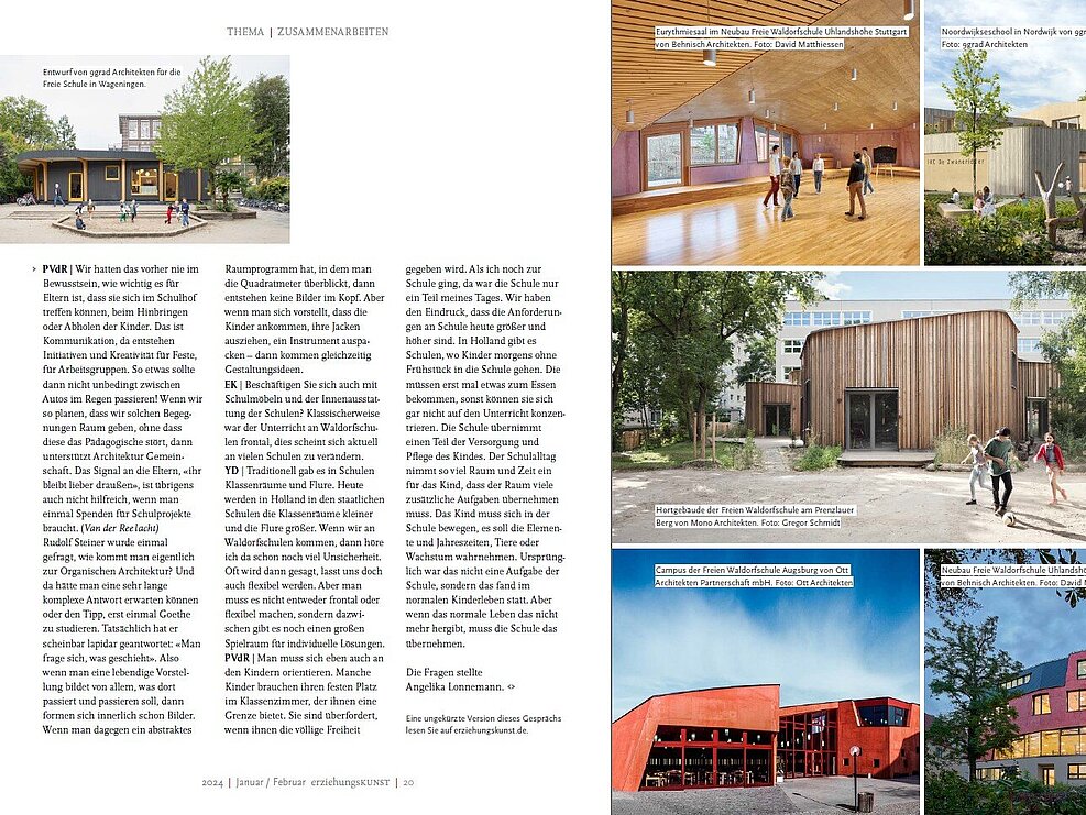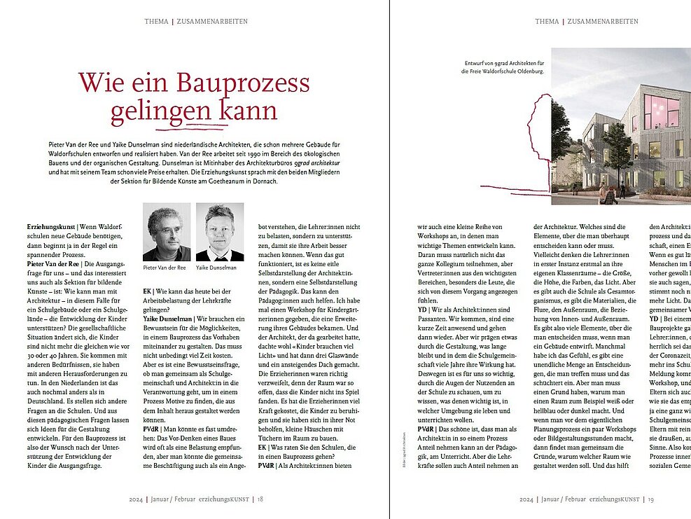 ErziehungsKUNST spricht in einem Interview mit Yaike Dunselman und Pieter van der Ree über den Entwurfs- und Bauprozess von Schulgebäuden. Dabei gehen sie der Frage nach, wie man als Architekt:in gemeinsam mit den Nutzern eine angemessene Antwort auf Entwicklungen im Bildungswesen geben kann. Wie kommt man zu einem Entwurf, der zur jeweiligen Schule passt? Welche Herausforderungen gibt es in einem solchen Prozess? Und welche Lehren können wir aus den Erfahrungen der beiden Architekten ziehen?