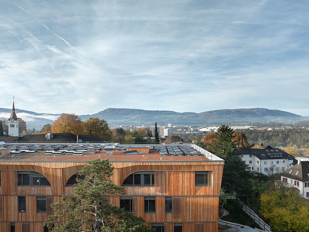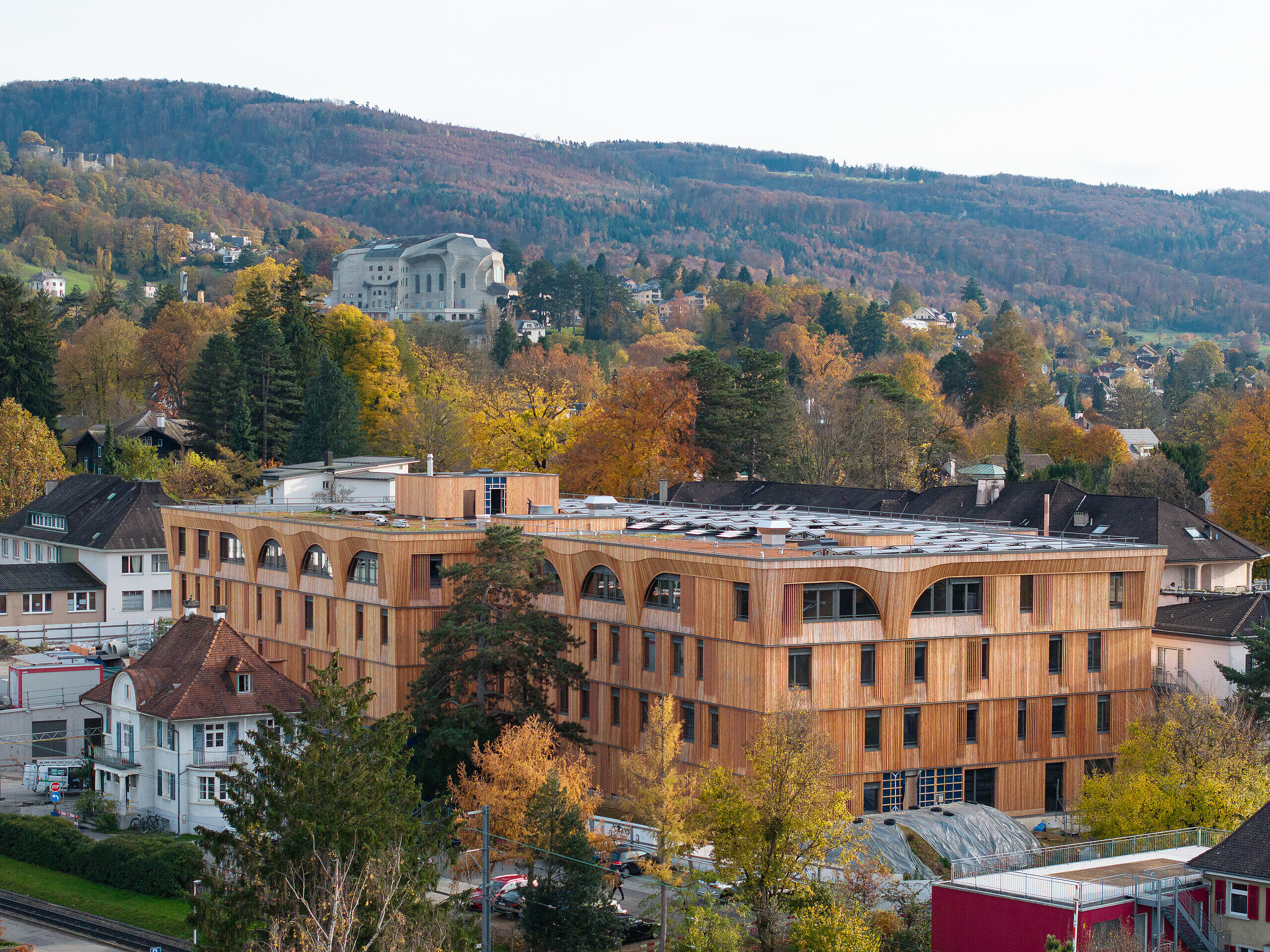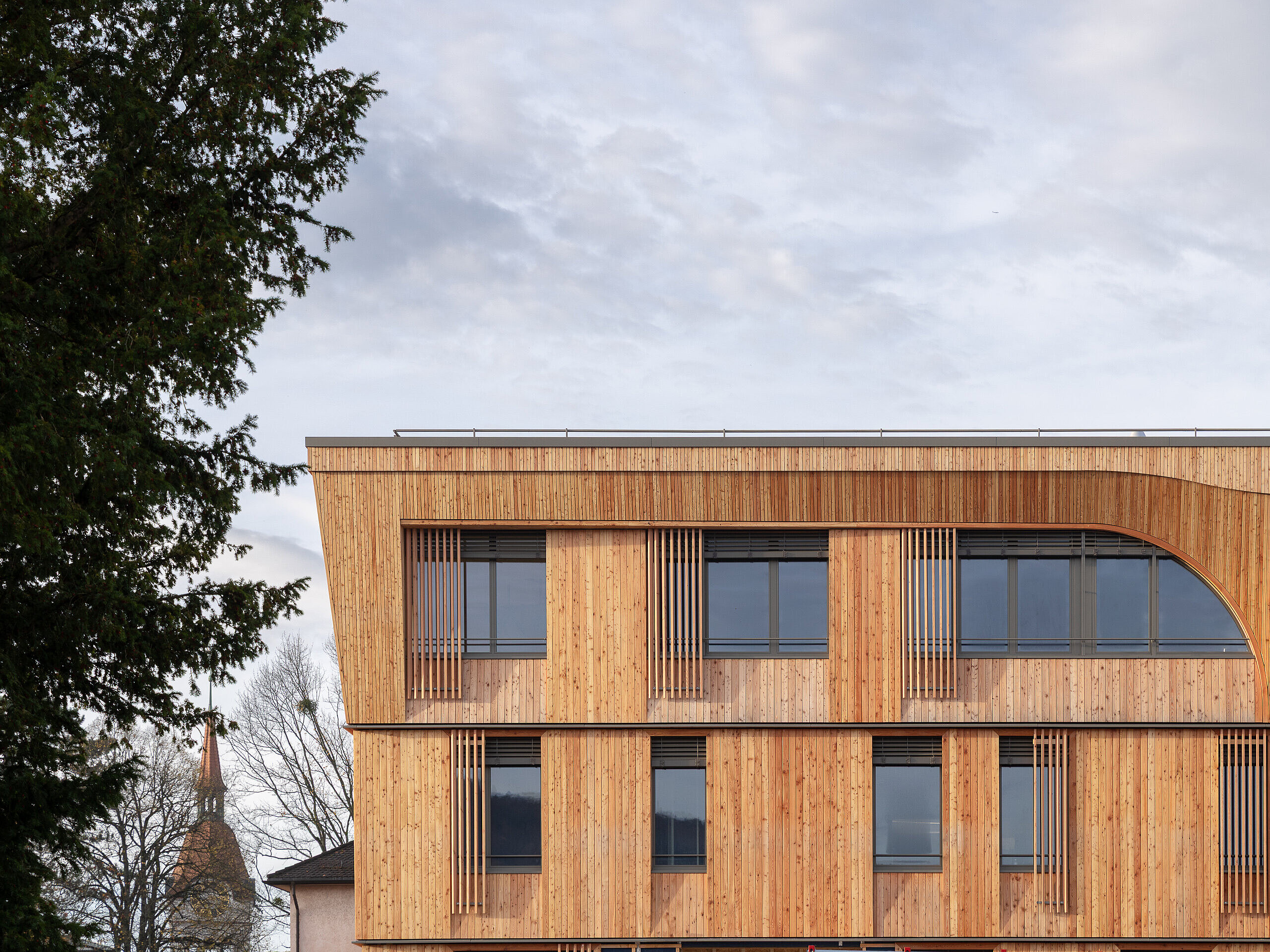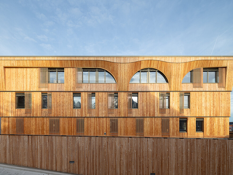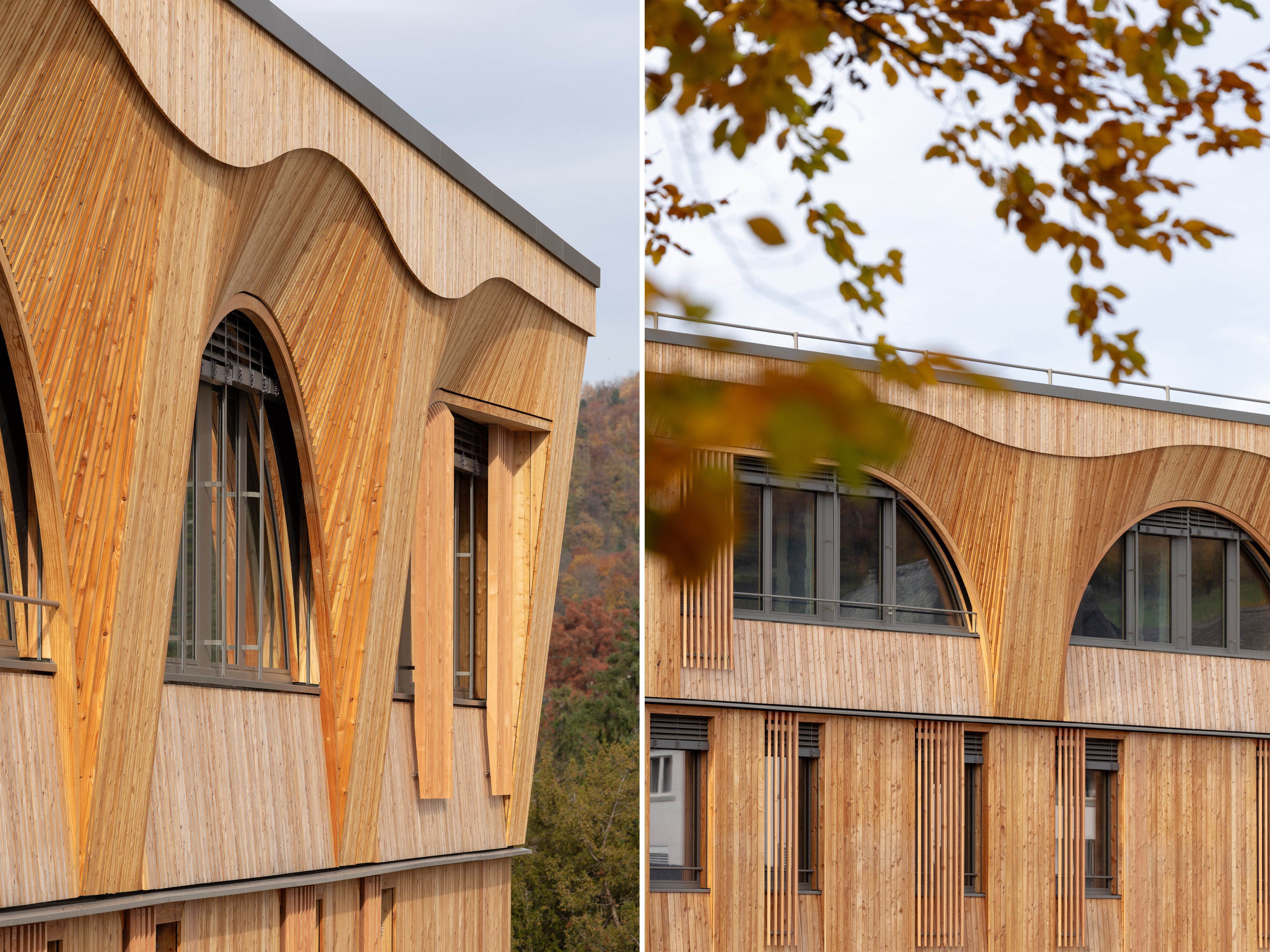Die in der Fassade des fertiggestellten Heilmittellabors vorhandene geometrisch-flächige Bogenform verwandelt sich im Krankenhaus zu einer skulpturalen dreidimensionalen Fassade mit halbkreisförmigen Fenstern. Die sich wiederholenden Fensterformen und die Plastizität der Holzfassade lassen das Gebäude ein- und ausatmen. Entsprechend der funktionalen Bedeutung sind die Patientenzimmer in der oberen Etage als «Krone» der Klinik platziert.