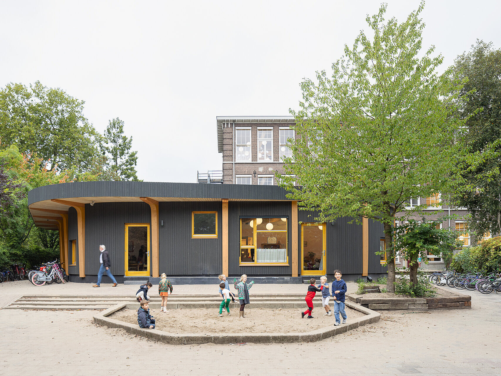 Das bestehende Gebäude wurde gemäß den zeitgemäßen Standards für Schulgebäude renoviert. Im Rahmen des Projektes wurde versucht, so viele bestehende Elemente wie möglich wiederzuverwenden; so wurde der neue Kindergartentrakt auf dem vorhandenen Erdgeschoss und Fundament eines früheren (halb)temporären Anbaus errichtet. Darüber hinaus kamen recycelte Türen und Fensterrahmen zum Einsatz. Die gesamte Materialisierung basiert auf biobasierten Prinzipien, darunter eine Holzständerbauweise (HSB)-Fassade, ein CLT-Dach und Flachs als Dämmmaterial. Durch den Einsatz großer, nach Süden ausgerichteter Dachauskragungen und einem dezentralen Belüftungssystem ist der Ersatzneubau als Low-Tech-Projekt konzipiert.