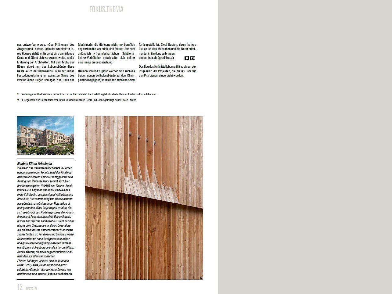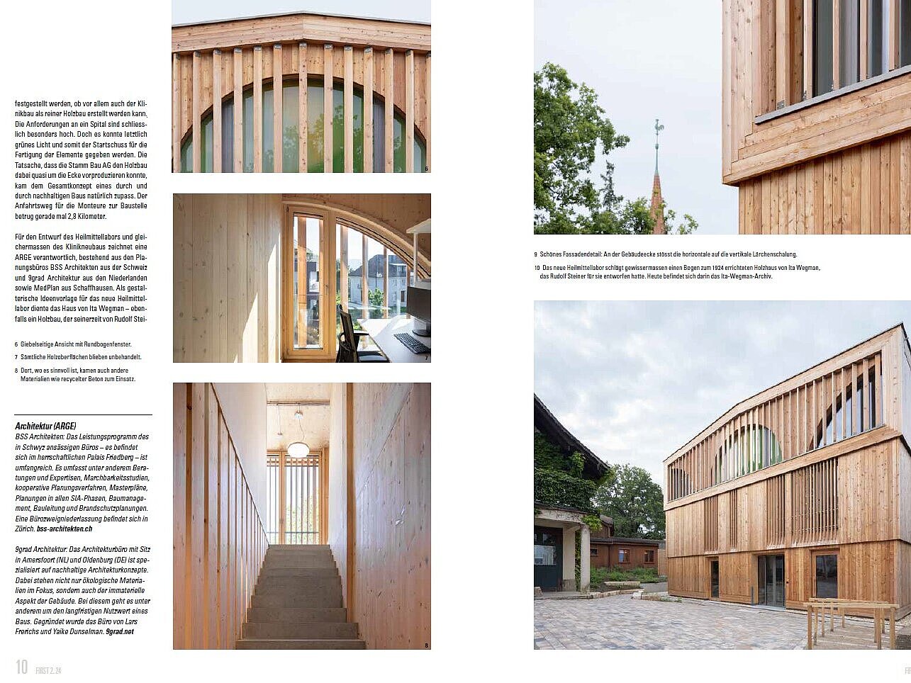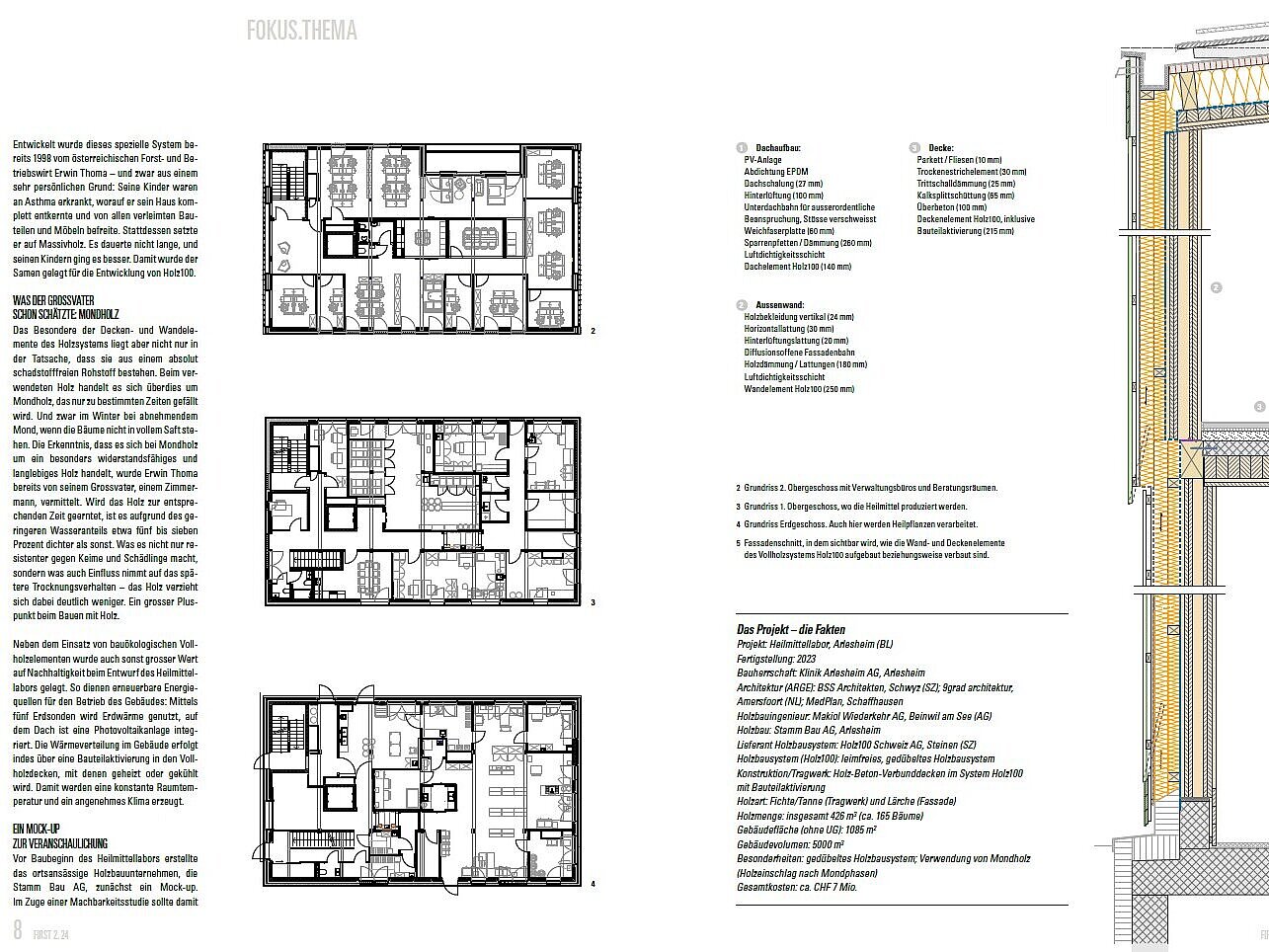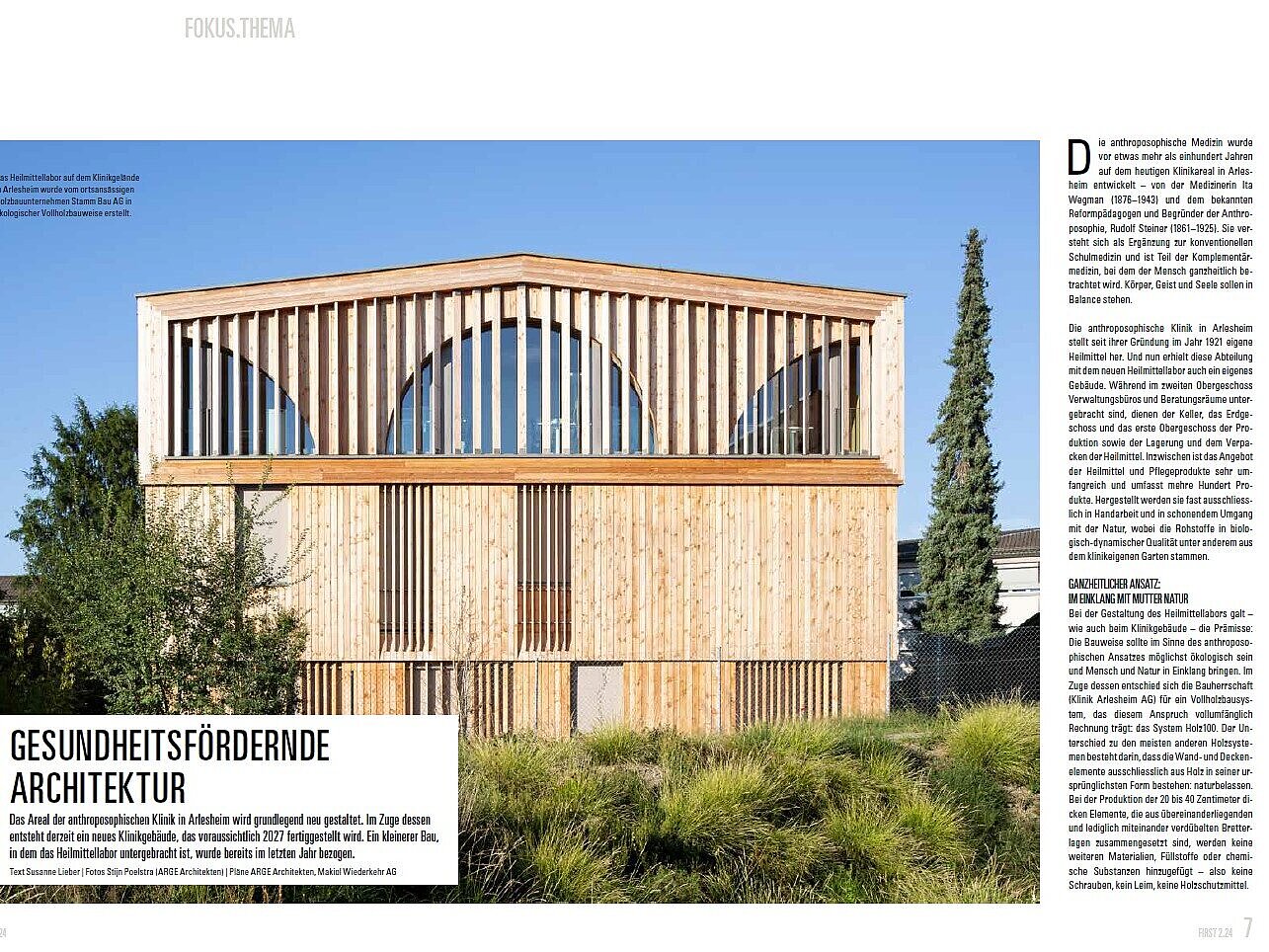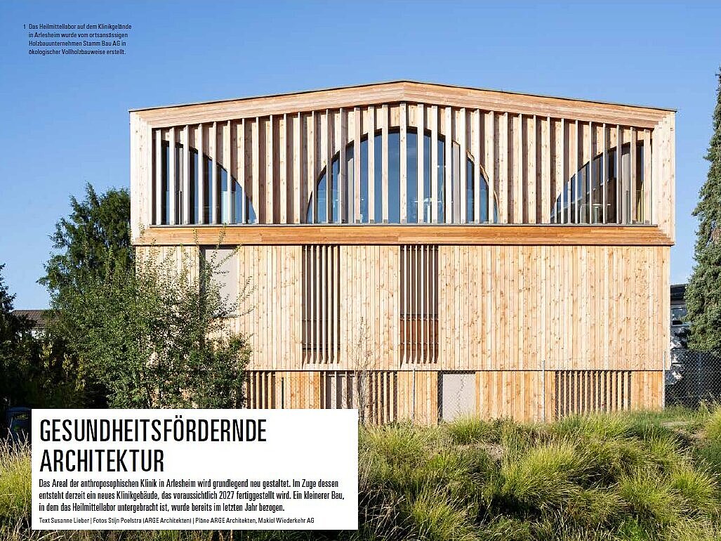 Aus dem Artikel: „Bei der Gestaltung des Heilmittellabors galt – wie auch beim Klinikgebäude – die Prämisse: Die Bauweise sollte im Sinne des anthroposophischen Ansatzes möglichst ökologisch sein und Mensch und Natur in Einklang bringen. Im Zuge dessen entschied sich die Bauherrschaft (Klinik Arlesheim AG) für ein Vollholzbausystem, das diesem Anspruch vollumfänglich Rechnung trägt: das System Holz100. Der Unterschied zu den meisten anderen Holzsystemen besteht darin, dass die Wand- und Deckenelemente ausschliesslich aus Holz in seiner ursprünglichsten Form bestehen: naturbelassen.“
