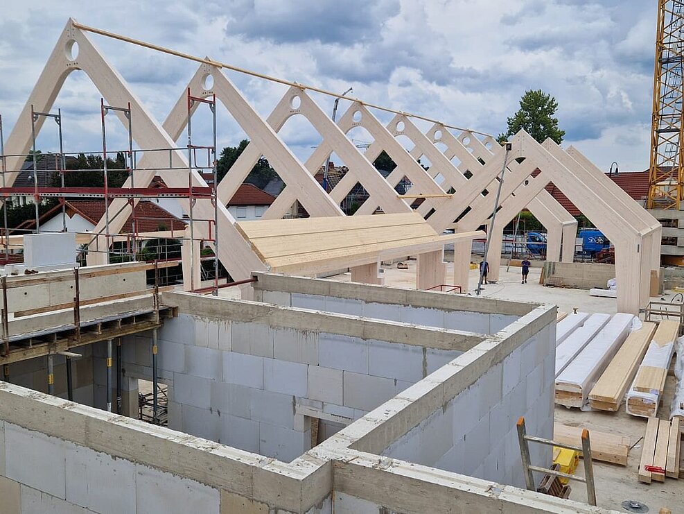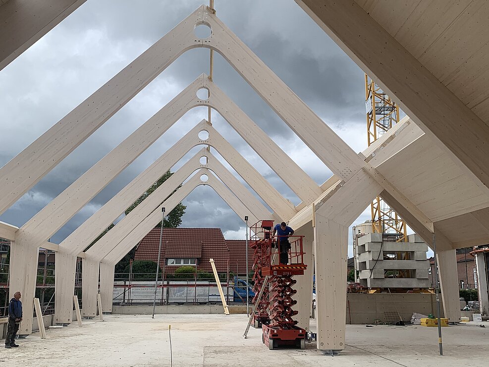 Das sichtbare Brettschichtholz und das weiß lasierte Massivholzdach geben bereits einen Vorgeschmack auf die zukünftige Atmosphäre des Verkaufsraumes.