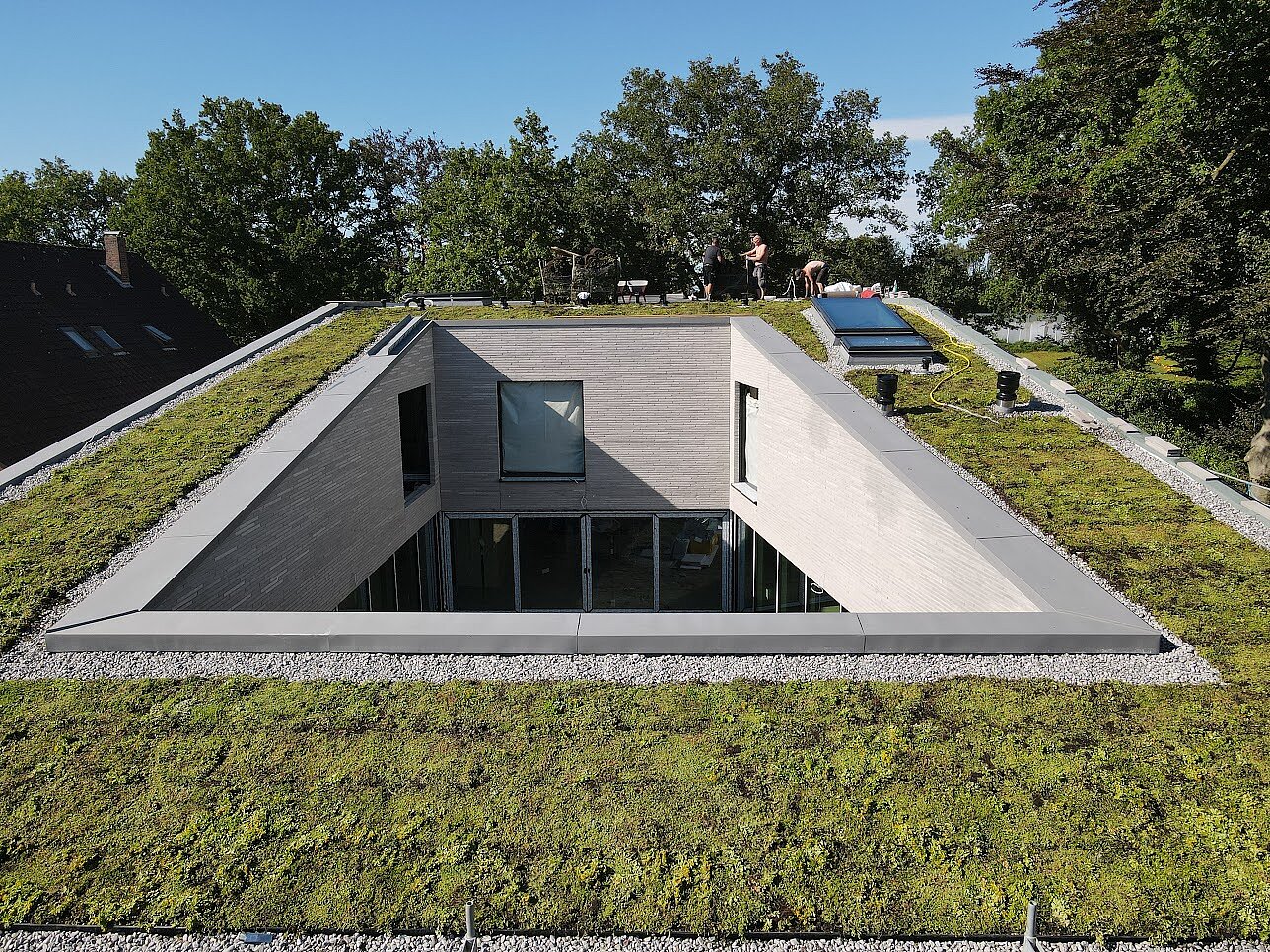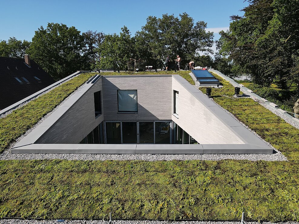 Das bauliche Umfeld besteht aus eingeschossigen Walmdach- und Krüppelwalmdachhäusern der späten 1970er- und frühen 1980er-Jahre. Die zurückhaltende und in sich gekehrte Anmutung der Nachbargebäude wurde in den Entwurf integriert, doch zeigt sich das Gebäude innen überraschend offen, kommunikativ und individuell gestaltet. Ein von allen Seiten erschließbarer Innenhof bildet das außenräumliche Zentrum des Hauses. Außenmauerwerk und Dachdeckung erhielten gleichfarbige Ziegel. Die Dachfläche ist begrünt und wird photovoltaisch genutzt.