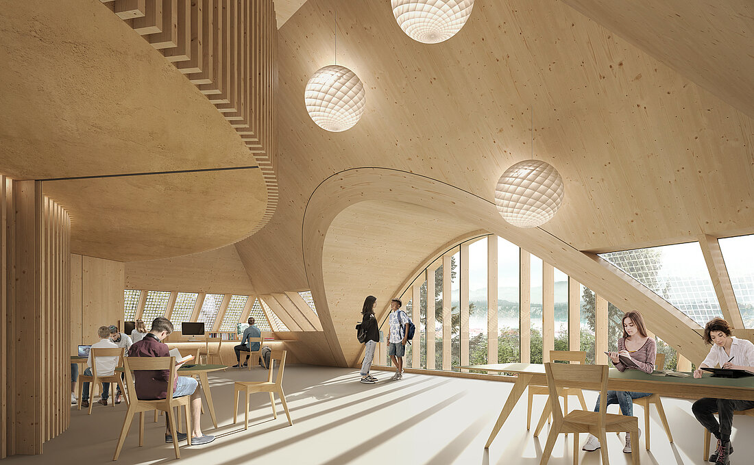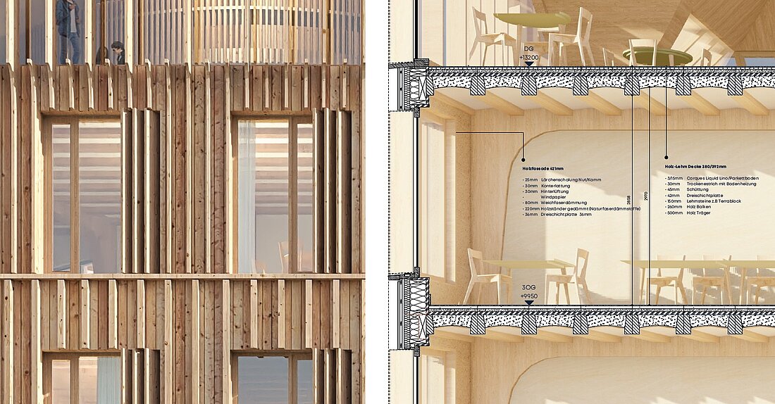 Für die Atelierschule schlagen wir eine ressourcenschonende Baumethode mit natürlichen und gesunden Materialien vor. Die Tragstruktur aus Stützen und Trägern wird mit Holz konstruiert. Für die Decken schlagen wir eine innovative und nachhaltige Holz-Lehm-Decke vor. Sie wirken wärmespeichernd und damit positiv aufs Raumklima. Bei der Fassade sehen wir eine materialschonende Holzständerkonstruktion mit Naturfaserdämmstoffen und einer unbehandelten Lärchenfassade. Diese Bauweise reduziert das notwendige Material, ist leicht und diffusionsoffen. Der an der Aussenseite mit Holz verkleidete Treppenkern aus Ortbeton gibt dem Gebäude einen atmosphärischen Schwerpunkt, erfüllt gleichzeitig die Anforderungen an den Brandschutz und unterstützt die Aussteifung des Gebäudes.