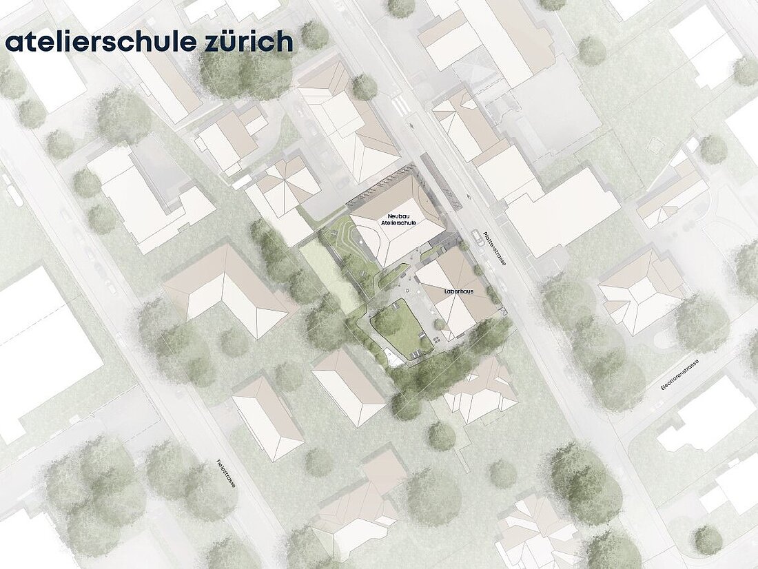 Wir sehen es als eine Herausforderung, den Neubau der Atelierschule zeitgemäss und mit Respekt vor der Geschichte in die bestehende städtebauliche Struktur zu integrieren, bestehende Qualitäten weiterzuentwickeln und mit neuen Ideen zu bereichern. Die Plattenstrasse und ihre direkte Umgebung wird durch eine historische Bausubstanz dominiert. Diese erleben wir als eine harmonische Struktur, in welche wir den Neubau sanft und passend einfügen möchten. Der Neubau setzt städtebaulich die Rhythmisierung der Gebäude entlang der Plattenstrasse fort. Die architektonische Ausbildung des Gebäudes setzt einen eigenständigen Akzent, und kommuniziert gleichzeitig mit der Umgebung. Die Baumasse, Proportion und Formensprache nimmt historische Aspekte auf, entwickelt Elemente daraus weiter und ist in ihrer Materialität zukunftweisend. Symmetrie, Volumetrie und Fassadeneinteilung gliedern sich harmonisch in die traditionelle Umgebung ein. Proportion, Fensterverhältnisse, Fensterläden und Fassadendetails werden sensibel weiterentwickelt. Der Holzbau mit seiner Holzfassade ist eine moderne Materialisierung, die die Atelierschule in ihrer Gestaltung mit den Aufgaben dieses Jahrhundert verbindet.