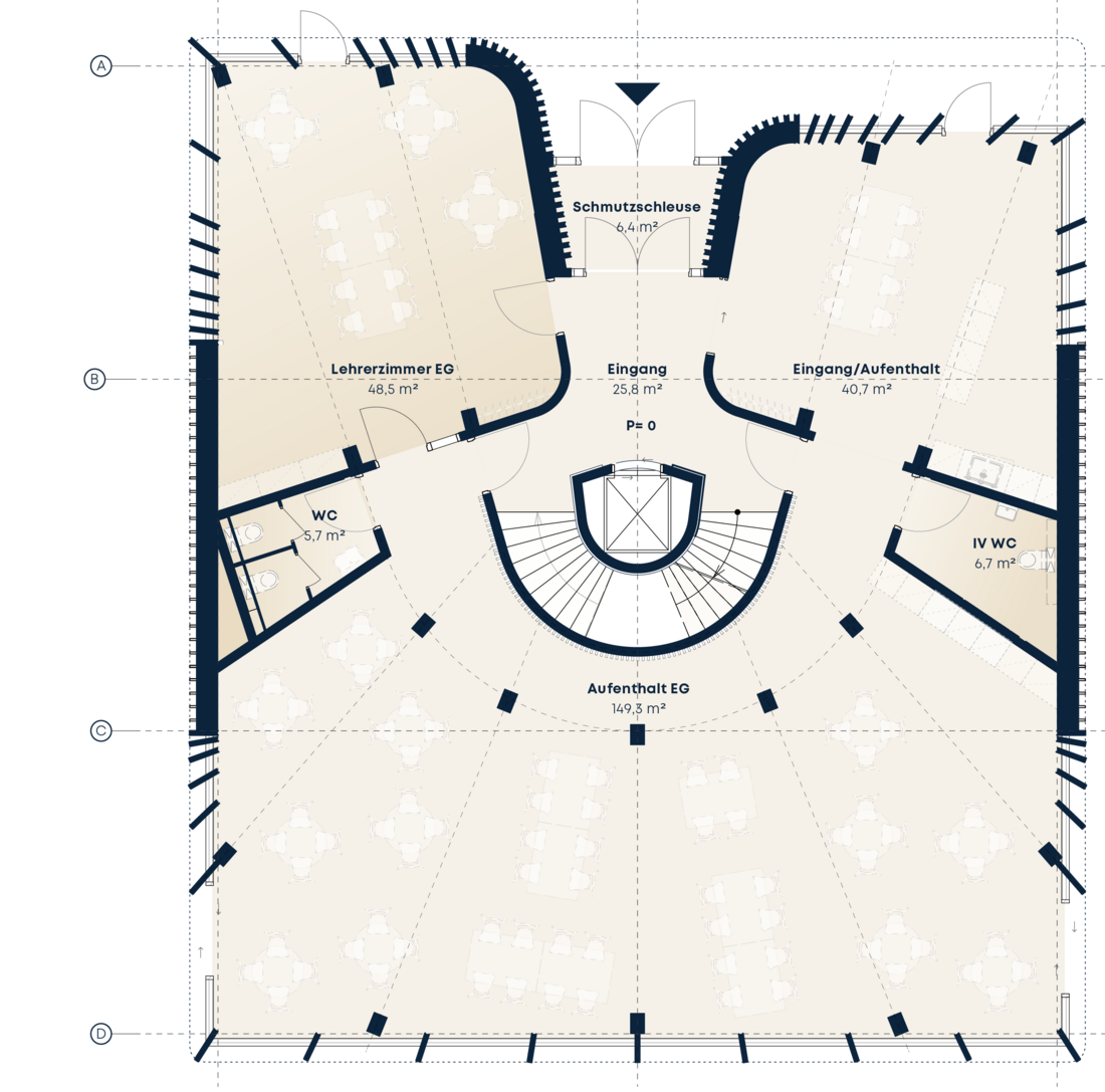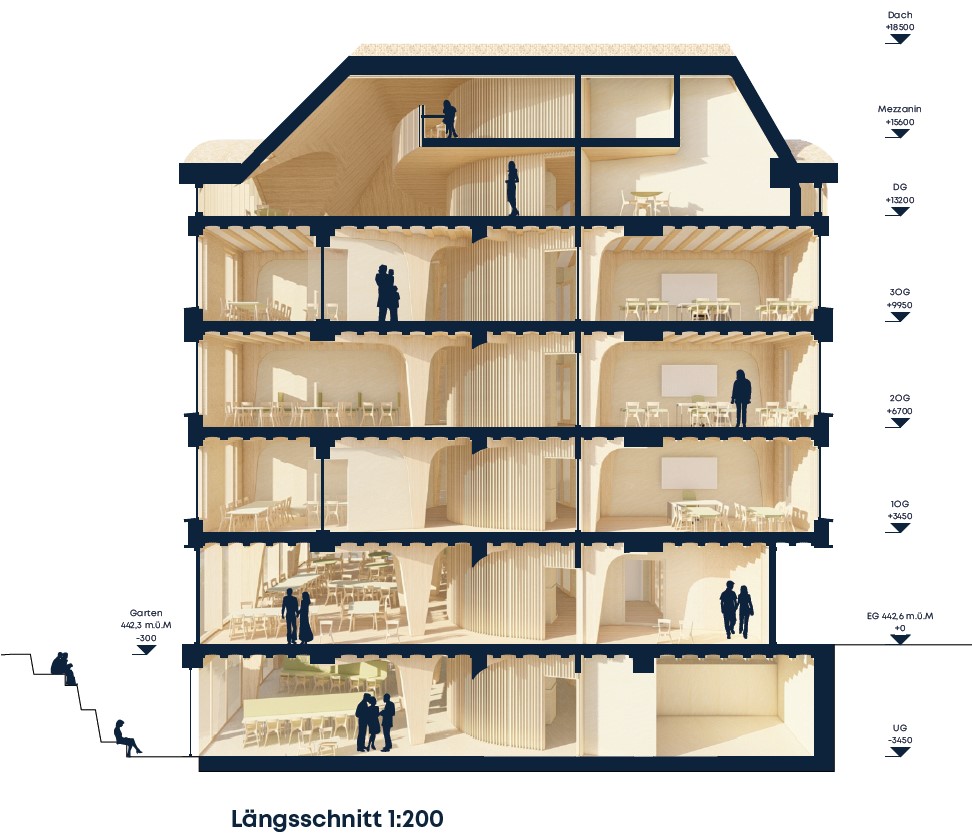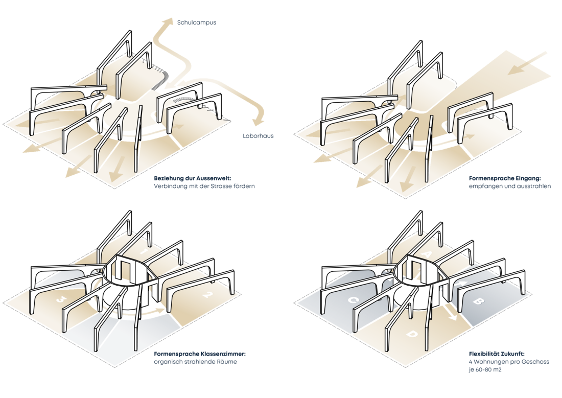 Das Sockelgeschoss ist als transparentes Schaufenster gestaltet. Mit einer einladenden Formensprache wird der Weg zum Haupteingang geleitet. In einer horizontalen, sich öffnenden Geste schafft die Architektur einen einladenden Bezug zur Aussenwelt. Damit fördern wir die Beziehung mit dem Schulcampus und dem Laborhaus. Der runde Dachausbau ist einerseits ein organischer Hinweis für das, was im Inneren des Gebäudes erfahren wird, anderseits zeigt die Architektur damit ihr Weltinteresse. Das zentrale Treppenhaus verbindet, als ein funktionaler und beweglich gestalteter Kern, die unterschiedlichen Geschosse. Um diesen Kern herum strahlen die Räume in einer offenen Gebärde in die Peripherie. Diese strukturelle Geste (Kern und Peripherie, Ich und Welt) zeigt sich als eine starke und identitätsprägende Form durch das ganze Gebäude und unterstützt das pädagogische Gesamtkonzept.