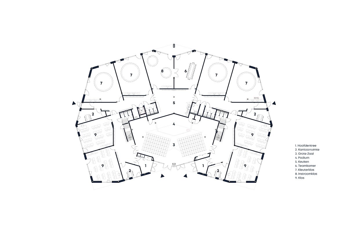 Das Gebäude besitzt eine klare räumliche Struktur, in der die pädagogische Vision in eine selbstverständliche räumliche Organisation übersetzt wurde. Die beiden Schulzüge sind symmetrisch im Gebäude angeordnet. Die Kindergartenkinder beginnen ihre Schulzeit auf der Gartenseite, in großen Klassenräumen mit einem geschützten und umhüllenden Charakter. Von den Klassenräumen aus ist der Zugang zur grünen Umgebung direkt möglich.