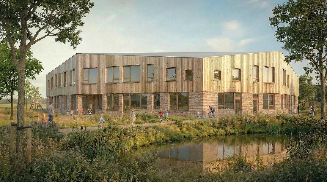 9grad architektur hat für die Stiftung Vrijeschool Almere ein neues Schulgebäude im städtischen Landwirtschaftsviertel Oosterwold entworfen. Der Neubau umfasst eine zweizügige Schule mit zwölf Klassen, vier Kindergartenklassen und einem Saal im Herzen des Gebäudes. Die Schule ist Teil eines Ensembles aus Schulgebäuden und Sporthallen, das zusammen die Maßstäblichkeit und Ausstrahlung eines Bauernhofs erhält. So entsteht ein Ort, an dem Innen- und Außenwelt für Kinder zusammenkommen.