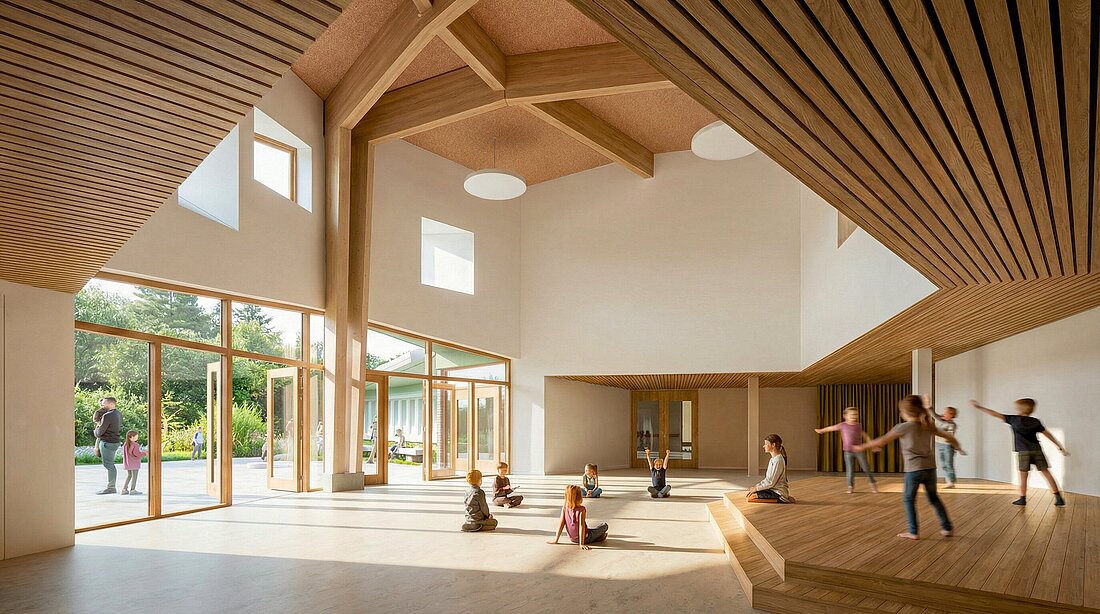 Der Haupteingang ist einladend und skulptural gestaltet und bietet durch die große Glasfront einen Blick auf den zentral gelegenen Saal. Der doppelt hohe Saal bildet das gemeinschaftliche Herz des Gebäudes. Hier finden gemeinsame Wochenanfänge und Jahresfeste statt; dank einer Bühne eignet sich der Raum auch für Musik, Bewegungserziehung und Theateraufführungen. An der Vorderseite markiert eine skulpturale doppelte Holzsäule den Übergang zwischen außen und innen. Die Säule ist ein zentraler Punkt im Gebäude – in ihrem Sockel ist der Grundstein der Waldorfschule eingelassen.