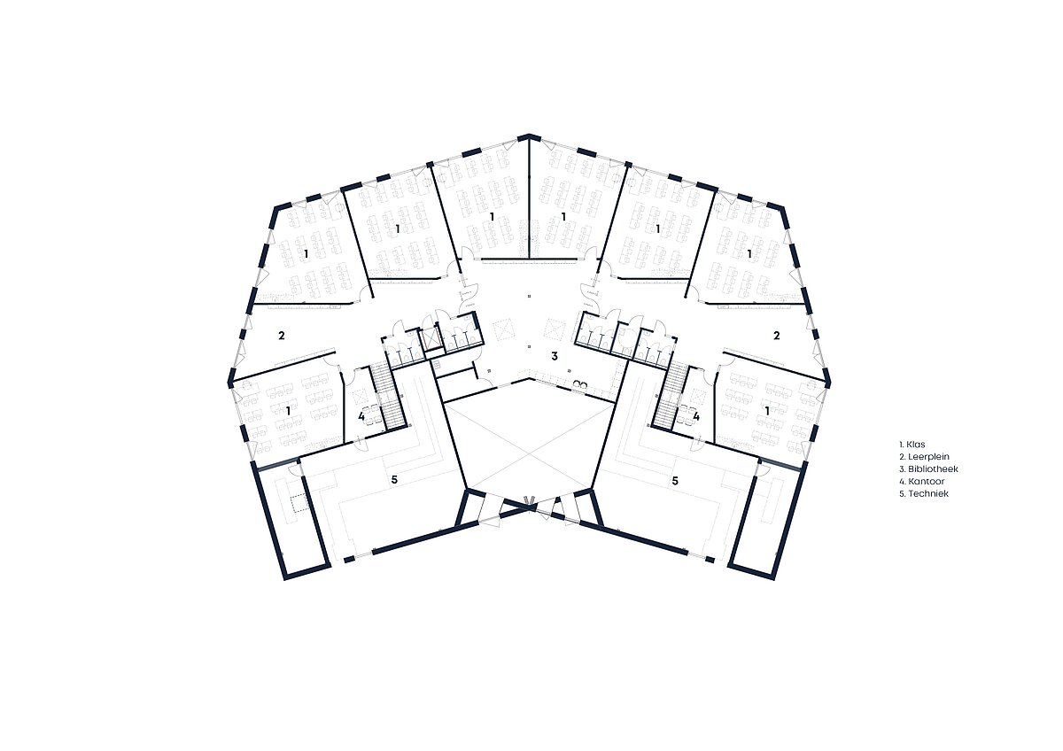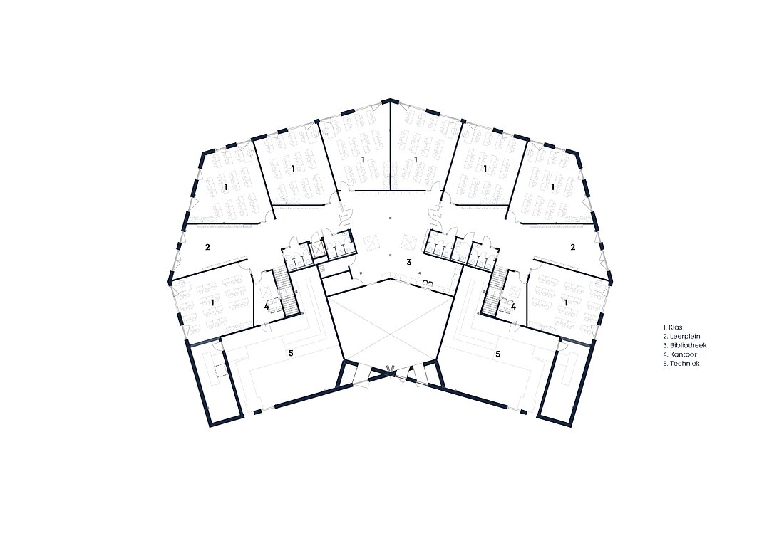 Nach der 1. und 2. Klasse im Erdgeschoss wachsen die beiden Schulzüge ab der 3. Klasse im Obergeschoss zunehmend aufeinander zu; im Zentrum sind die beiden sechsten Klassen um eine gemeinsame Bibliothek gruppiert. In der Freien Waldorfschule Oosterwold begleitet die Lehrkraft die Schülerinnen und Schüler durch ihre Schulzeit – gemeinsam durchlaufen sie das Gebäude wie eine Reise.