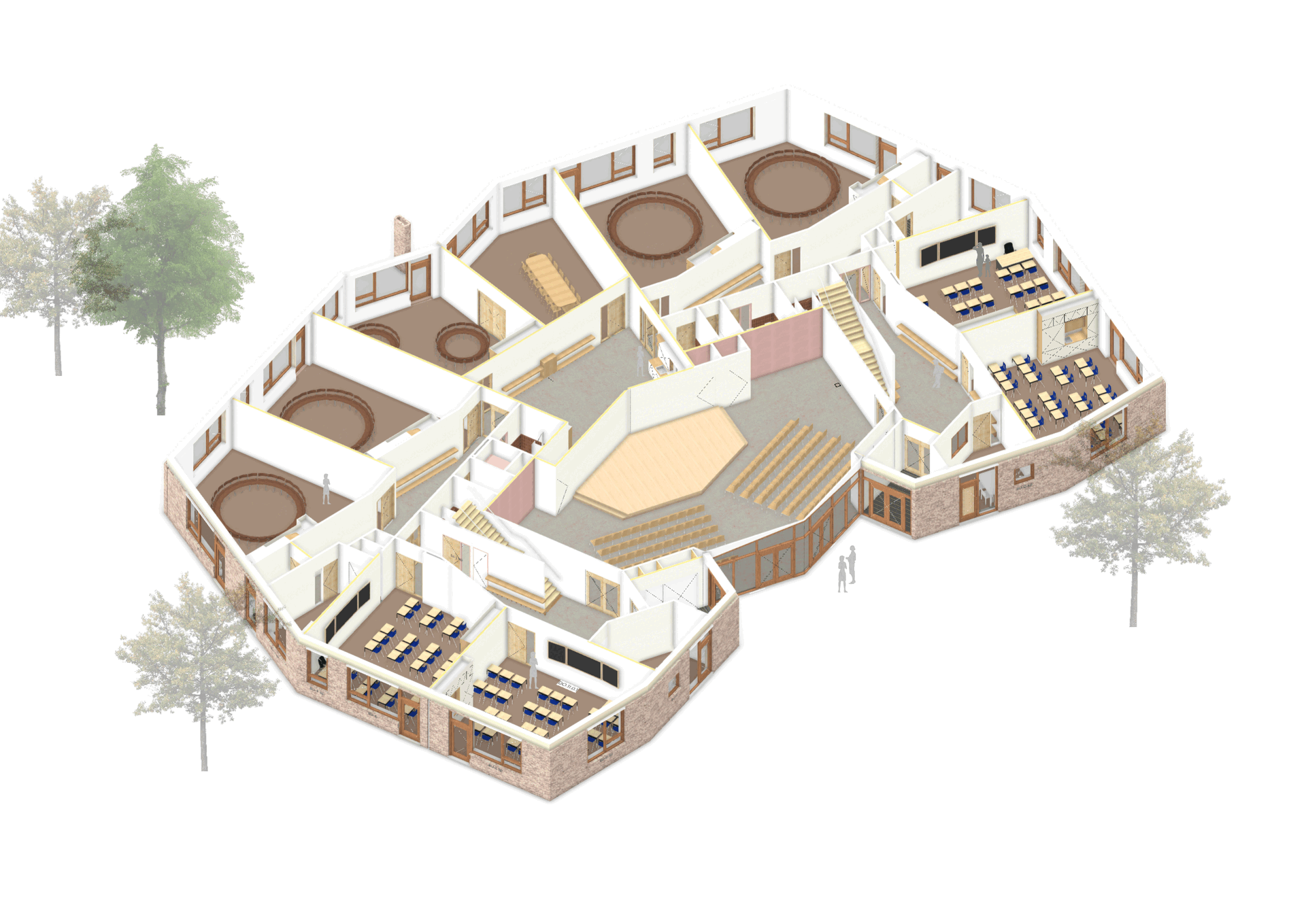 Die Architektur des Gebäudes folgt diesem Zyklus: von den geschützten Kindergartenräumen mit warmen Farben auf der Rückseite über die unteren Klassen im Erdgeschoss bis zu den helleren und höheren Klassenräumen im Obergeschoss, in denen Raum für individuelle Entwicklung entsteht.