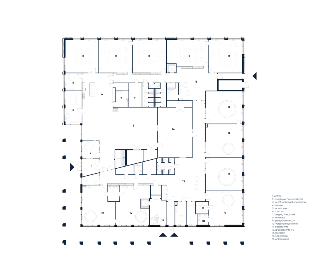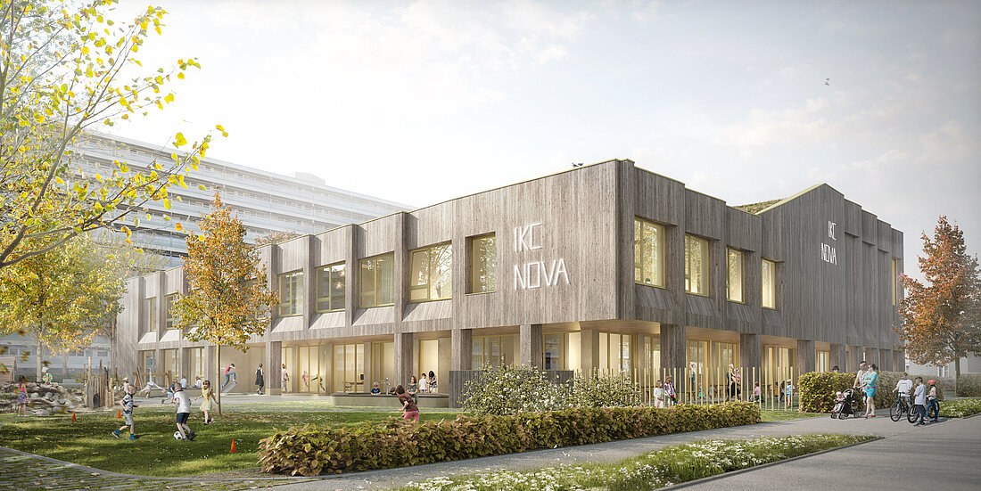 IKC Nova vereint regulären und sonderpädagogischen Grundschulunterricht unter einem Dach. Flexibilität, Übersichtlichkeit und Zugänglichkeit waren leitend für die architektonische Konzeption. Die Tragstruktur aus flexibel teilbaren und rückbaubaren Stützen ermöglicht eine hohe Anpassungsfähigkeit an zukünftige Unterrichtsformen und Gruppenzusammensetzungen. Das Raumprogramm umfasst unter anderem Besprechungsräume, multifunktionale Bereiche, einen „grünen Raum“ sowie spezifische Räume für das sonderpädagogische Lernen. Im Zentrum des Gebäudes liegt ein lebendiger Gemeinschaftsbereich mit Aula, Spielfluren und Eingangszone – ein vielseitig nutzbarer Ort für Feste, Elternabende und Veranstaltungen im Stadtteil.