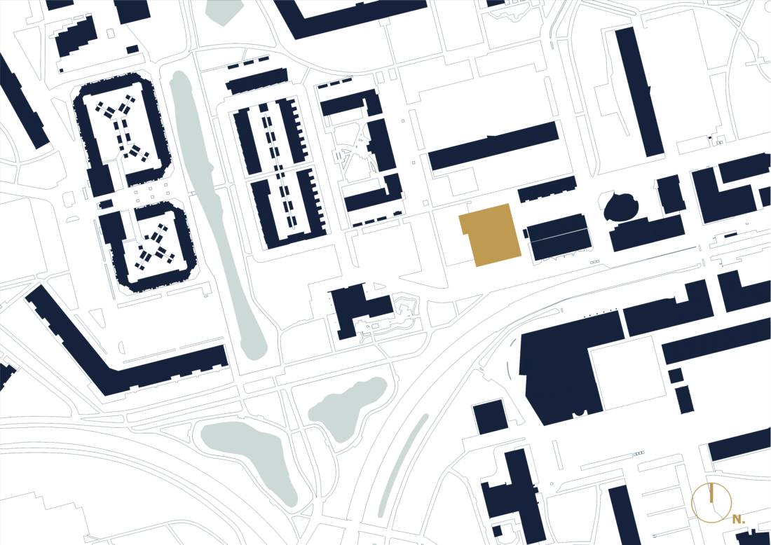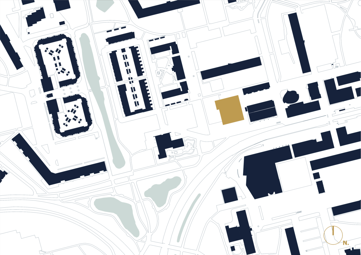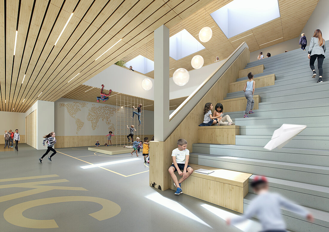 Der Neubau präsentiert sich als kompakter, allseitig orientierter Baukörper in orthogonaler Struktur – in Anlehnung an die modernistische Stadtplanung des Viertels. Ein markanter Einschnitt in den Baukörper öffnet das Volumen zur Parkstruktur hin und schafft eine fließende Verbindung zwischen Innen und Außen. Der Park dehnt sich auf das Schulgelände aus und setzt sich bis in das Gebäudeinnere fort. Ein sanft herausgehobener Baukörper für die Sporthalle verleiht dem Ensemble eine dynamische Silhouette und macht IKC Nova zu einem zeitgemäßen Orientierungspunkt im Quartier – ein einladender und zukunftsweisender Lernort.