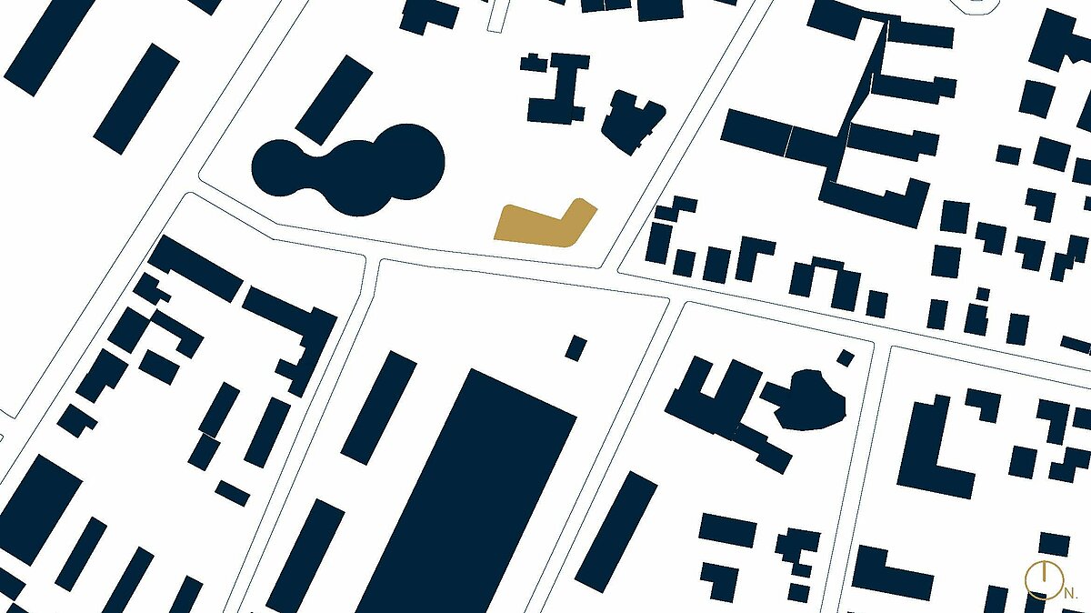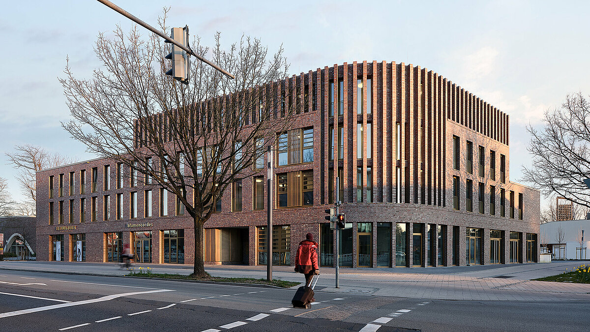 Die Architektur nimmt einerseits Bezug zu den stadtteilprägenden massiven Kasernenbauten der 1930er Jahre, sowie zu den benachbarten zurückhaltend gestalteten und verklinkerten Nachkriegsbauten der 1950/60er Jahre. Insbesondere aber bildet der Neubau ein gestalterisches Ensemble mit dem von 9grad architektur gestalteten Supermarkt. Mit seiner raumbildenden Kante und exponierten Lage an einer Straßenkreuzung, sowie seiner individuellen Fassadentextur zeigt sich das Wohn- und Geschäftshaus selbstbewusst.