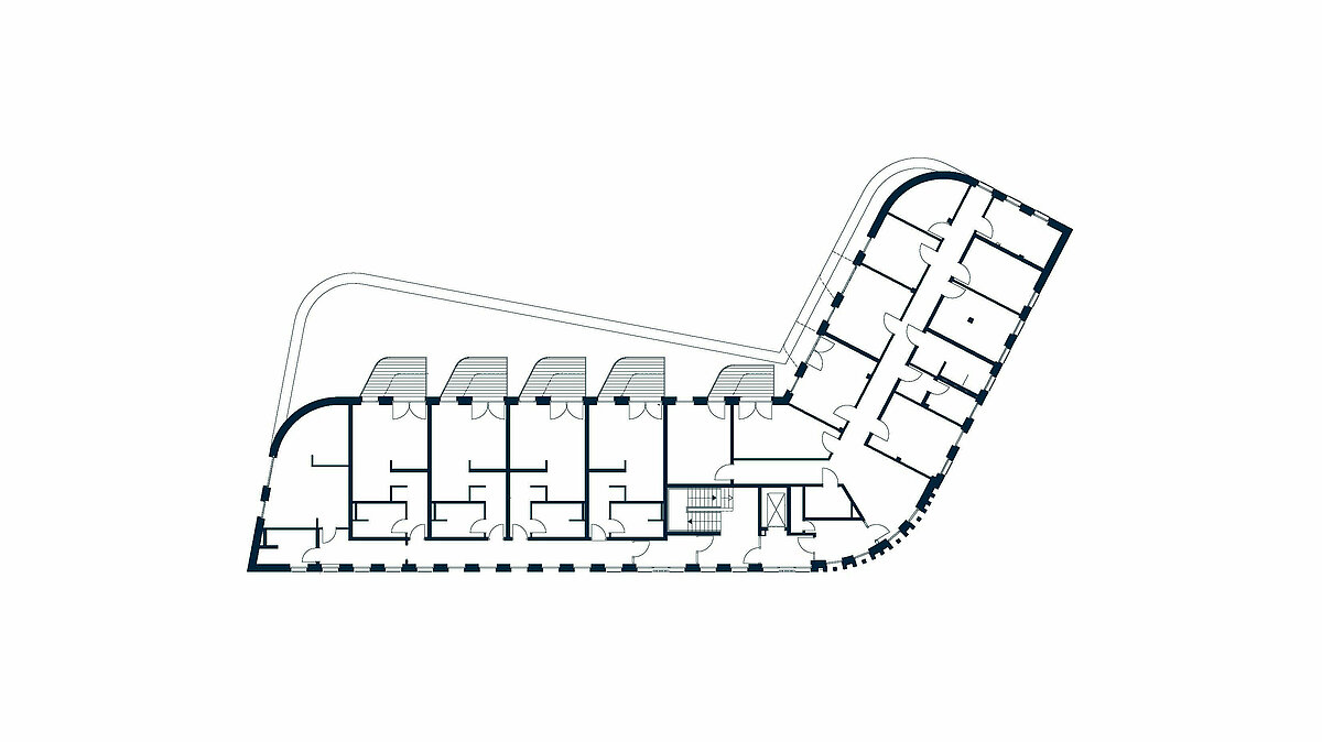 Im Erdgeschoss befinden sich vier kleine Gewerbeeinheiten, im 1. Obergeschoss Arztpraxen, in den anderen Geschossen gibt es 14 Wohnungen unterschiedlicher Größe. Die Werbung für die Gewerbeeinheiten zeigt sich einheitlich in warmer metallischer Optik entsprechend der benachbarten Supermarktarchitektur.