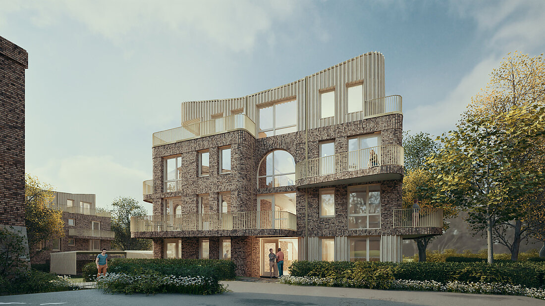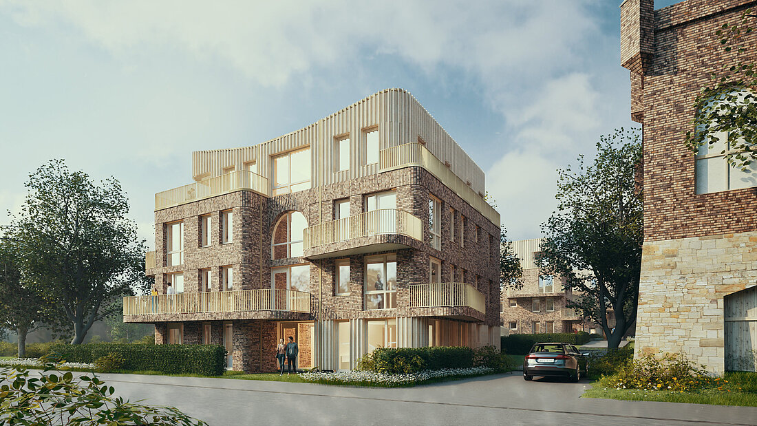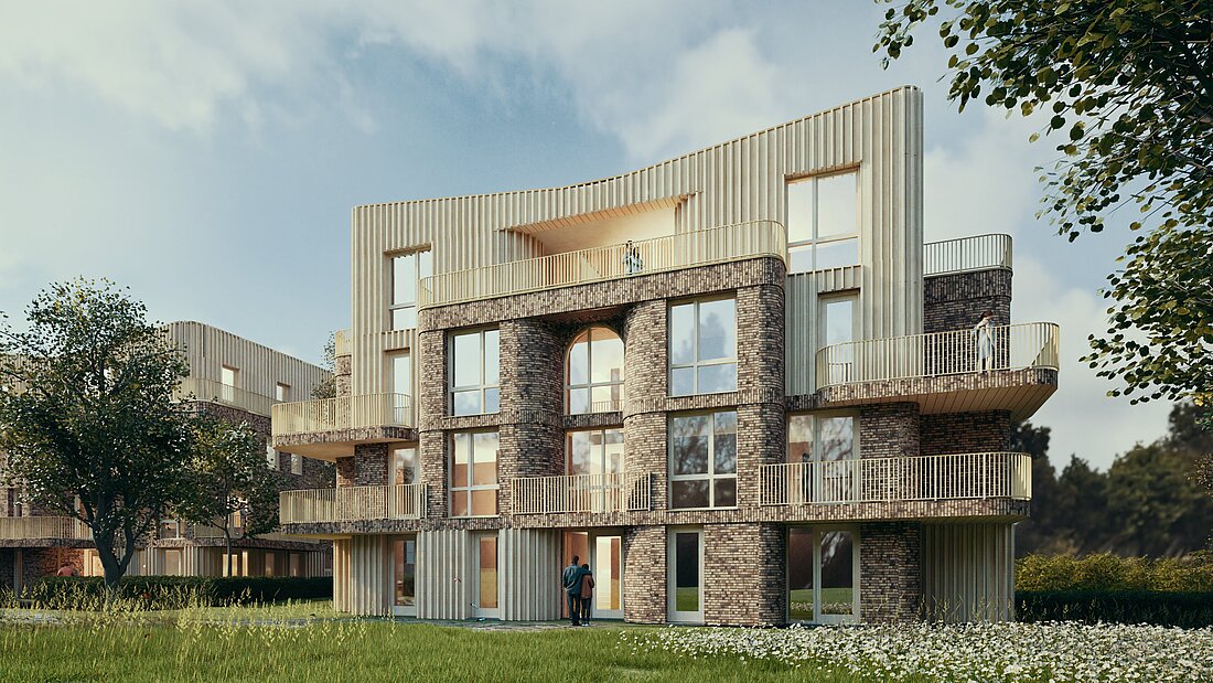 In enger Abstimmung gemeinsam mit dem Architekten Adam Fray von der Eugebau entwickelten 9grad architektur und Pieter van der Ree das architektonische Konzept für fünf neue Wohngebäude. Die Entwurfsstrategie versteht sich als zeitgenössische Interpretation der prägenden Merkmale des Bestands. Elemente wie Rundbögen und handwerklich ausgeführte Ziegelfassaden finden in verfeinerter, organisch formulierter Form ihren Widerhall in der Neubauarchitektur. Die volumetrische Gestaltung, Dachformen, Balkone sowie Öffnungen in Fassaden und Türen folgen einer formalen Sprache, die eine tiefe Verbindung zwischen Mensch und Natur anstrebt. Die Neubauten treten dabei bewusst in Kontrast zur funktionalen Rationalität des historischen Schlachthofs – mit weichen Linien, abgerundeten Fassaden und hellen Dächern, die Leichtigkeit ausstrahlen und einen sanften Übergang zur Umgebung schaffen. Damit wandelt sich die Identität des Areals von „Schlachthof“ zu „sozialer Interaktion und Menschlichkeit“.
