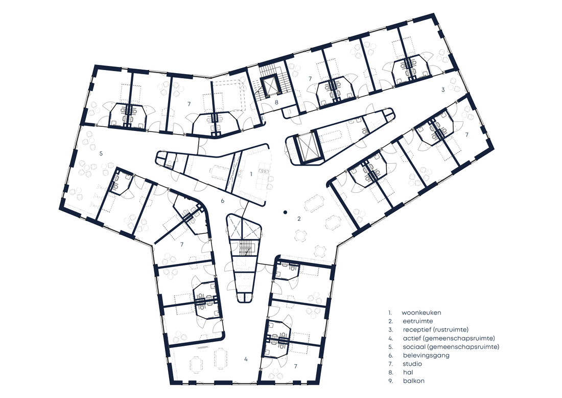 Gemeinsam mit dem Auftraggeber hat 9grad architektur die Wohnvision von Warande in ein zukunftsfähiges Pflegekonzept übersetzt, das auf eine neue Form des Zusammenlebens im Pflegeheim abzielt. Die Pflege verändert sich – und mit ihr die Anforderungen an Raum, Architektur und Alltag. Im Mittelpunkt steht dabei nicht mehr der „Pflegebedürftige“, sondern der Mensch mit seiner individuellen Lebensgeschichte und seinen persönlichen Bedürfnissen. Dieser Ansatz prägt auch die Architektur: Eine häusliche Atmosphäre, die das alltägliche Leben in den Vordergrund rückt, wird zum Leitmotiv. Nach dem Neubau des Leendert Meeshuis entwirft 9grad architektur aktuell die Ersatzneubau für das Huize Valckenbosch –eine Pflegeeinrichtung, in denen anthroposophisch inspirierte Pflege geleistet wird.