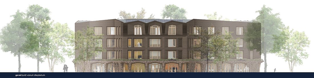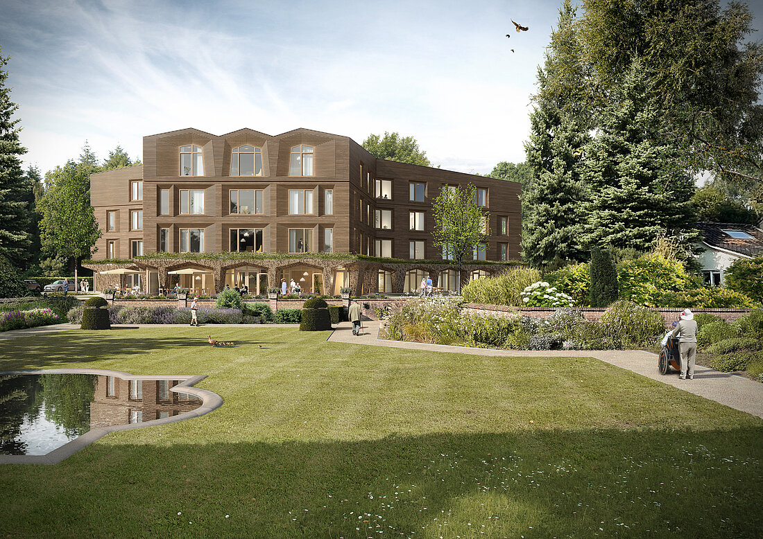 Der Neubau für Huize Valckenbosch entsteht auf einem großzügigen Grundstück, das an einen charakteristischen, großen Garten inmitten eines Wohnviertels in Zeist grenzt. Die Beziehung zwischen Gebäude und Garten wurde architektonisch präzise aufgenommen: Das neue Volumen reagiert auf die Symmetrie des Gartens mit einer klar definierten Gebäudekubatur und einer fein ausgearbeiteten, zeitgemäßen Fassadengestaltung. Mit respektvollem Abstand zu den bestehenden Villen entsteht ein großzügiger Vorplatz zwischen dem neuen Eingangsbereich und der angrenzenden Rafaëlkerk im Norden. Die neue Bebauung nimmt Bezug auf das gemeinsame kulturelle und spirituelle Erbe mit der Kirche, die – ebenso wie das Haus – der Christengemeinschaft dient. Die Verbindung von anthroposophischer Pflege und christlich-spirituellem Leben bildet die unverwechselbare Identität von Huize Valckenbosch. Im Neubau entstehen Räume für soziale, künstlerische und spirituelle Aktivitäten – ein pulsierendes Herzstück mit fließenden, organisch geformten Raumfolgen. Unterschiedliche Wohnqualitäten auf jeder Etage sorgen für Vielfalt und Individualität – keine Ebene gleicht der anderen. Offene Gemeinschaftsbereiche fördern spontane Begegnungen und ermöglichen, dass sich Neues ganz selbstverständlich entfalten kann.