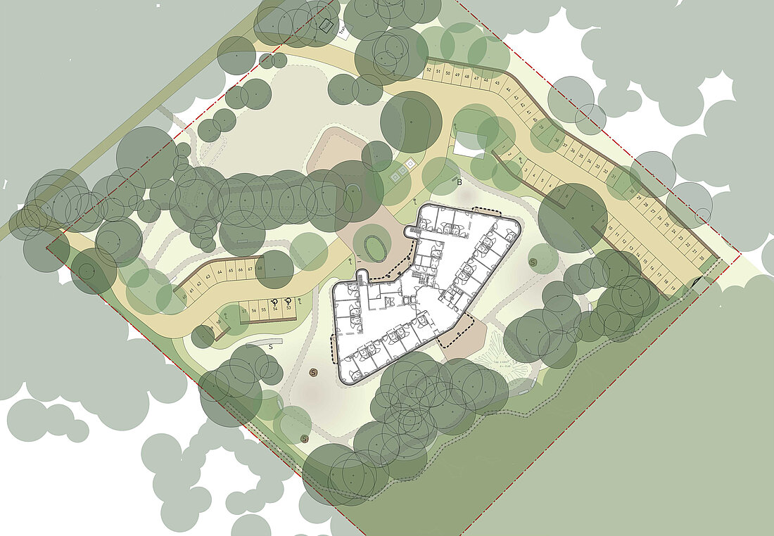Der Neubau befindet sich auf einem großzügigen Grundstück in einem Waldgebiet in Zeist, südlich von Utrecht. Die natürliche Lage bietet viel Schutz und übt eine heilende Kraft auf die Bewohner und Mitarbeiter aus. Die Bewohner sind daher eingeladen, sich frei auf dem Gelände zu bewegen und so den positiven Einfluss der Natur wahrzunehmen. Der Neubau steht als kompakter, organisch gestalteter Baukörper in der Landschaft. Die beiden Gebäudeflügel empfangen die Besucher. Ergänzt wird der Neubau durch einen kleinen Gemeinschaftspavillon, in dem Bewohner und Besucher zu Festen, Gesprächen und Konzerten zusammenkommen können.