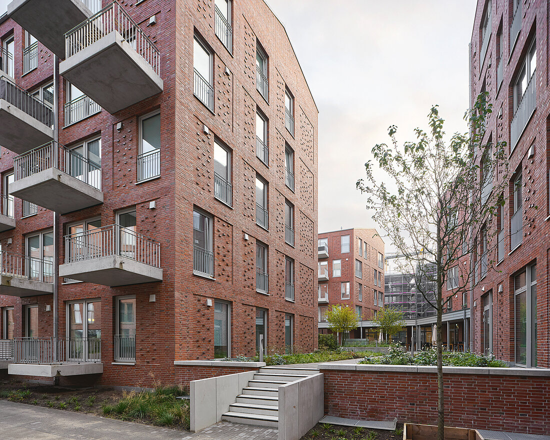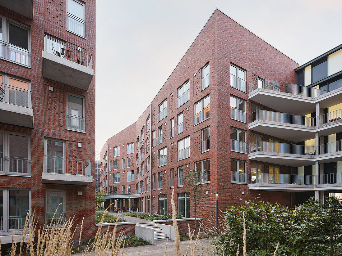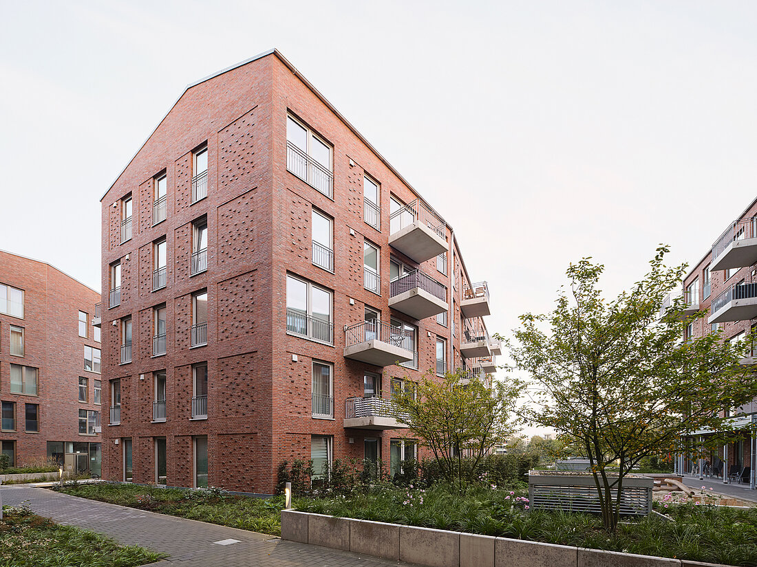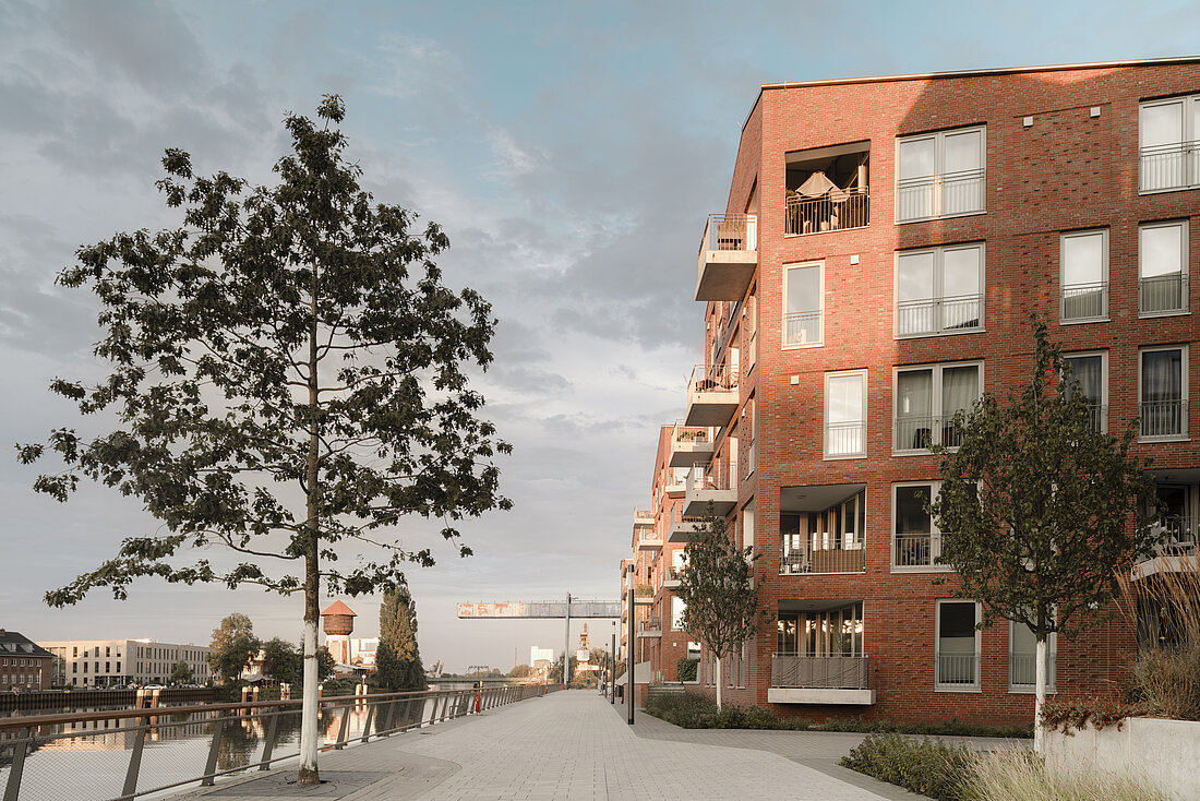 Der städtebauliche Leitplan sieht unter anderem die Ausbildung eines Gebäudes in Kammstruktur mit drei zum Wasser geöffneten Höfen vor, die sich entlang der Straße zu einem schützenden Rücken vereinen. 9grad architektur hat den mittleren U-Hof entworfen. In einem gemeinsamen Prozess wurden die Vorentwürfe mit dem Stadtplanungsamt, der Auftraggeberin und den Architekturbüros der benachbarten Höfe (Angelis & Partner Architekten mbB, Oldenburg und HS Architekten PartGmbB, Hamburg) entwickelt. Dabei wurden wichtige Gestaltungsparameter festgelegt, darunter die Wahl des Klinkers, eine gewisse Kleinteiligkeit der Baukörper sowie die Anordnung geneigter Dächer.